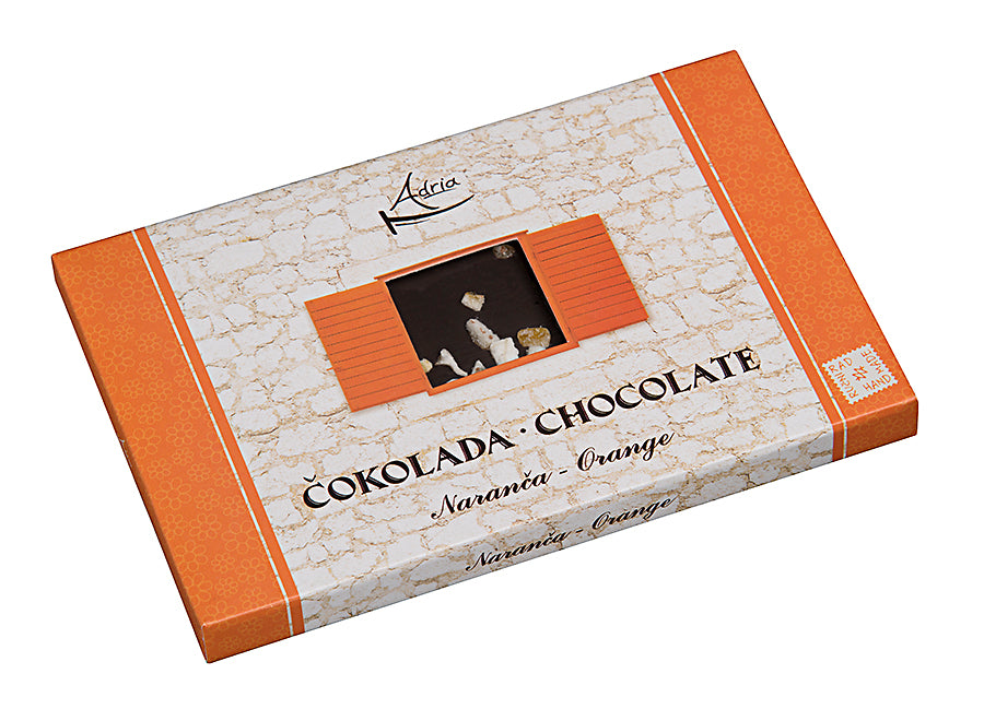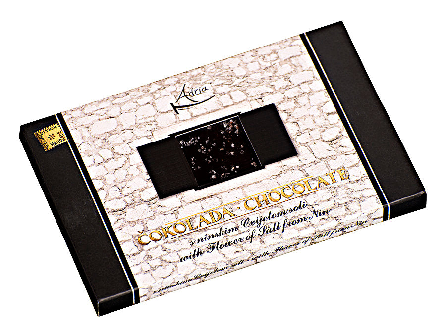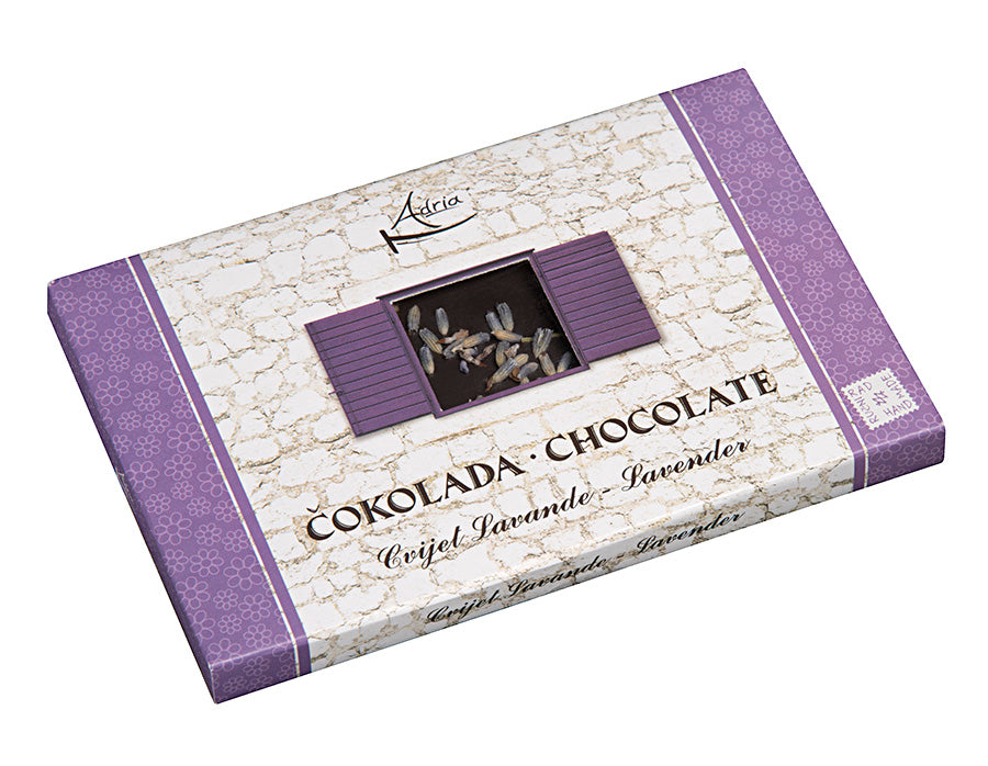 Handgemachte dunkle Adria-Schokolade mit Zusatz von Lavendel, Johannisbrotbaum, Pinienkernen, Salzblume, Orange oder rotem Pfeffer zieht mit ihrem Geschmack, Geruch und Aussehen die hingebungsvollsten, anspruchsvollsten und raffiniertesten Kenner an. Es ist eine Schokolade, die nach Mittelmeer riecht und dem Gaumen die Atmosphäre von Sonne, Meer, Salz und Wellen vermittelt, die die Küste und die Felsen berühren.